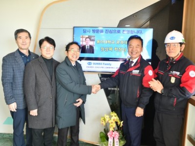 On February 16, officials from Dong-A University's College of Engineering visited SUNBO Industrial's headquarters and shared plans to strengthen industry-academia cooperation. Sangmok Jang of the College of Engineering, Professor Byeongjun Shin of the Department of Materials Science and Engineering, and Professor Jeonggyu Lee of the Department of Chemical Engineering visited the factory this morning and participated in a field trip and a meeting with executives. The faculty identified the points of contact between the new business areas of interest and the on-campus research areas and discussed ways to strengthen cooperation. In addition, he introduced the status of ongoing research and innovative technologies and expressed his will to link business with SUNBO. In addition, they shared a consensus on employment trends and the need to connect excellent graduates with employment, and exchanged opinions on specific action plans. SUNBO executives and employees who listened to the professors' suggestions proposed various measures, including strengthening the industrial inspection program.