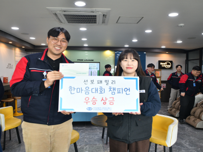 12월 23일 오후, 다대1공장 4층 대교육장에서는 동료들과 웃음을 나누며 연말 분위기를 함께 즐기는 한마음대회가 열렸다. 한마음대회는 ‘참참참’과 ‘묵찌빠’ 두 가지 종목으로 진행됐으며, 부서 구분 없이 2인 1조로 팀을 구성해 총 8팀이 참가했다. 단순한 게임이었지만 점수가 걸린 승부인 만큼 현장은 응원과 웃음, 탄성이 끊이지 않았다.두 종목 합산 점수로 최종 순위를 가린 결과, 1등 팀에게는 10만 원, 2등 팀에게는 6만 원의 상금이 수여됐다. 짧지만 유쾌했던 한마음대회는 선보Family에게 뜻깊은 시간이 됐다.