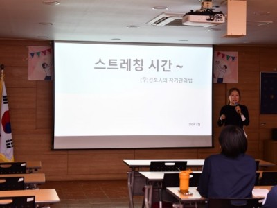 5월 8일 선보공업 본사에서 ‘선보人의 자기관리법’을 주제로 업무 전 스트레칭에 관한 이론·실전 교육이 진행됐다. 선보Family는 김주련 강사의 지도 하에 부위별 통증 원인과 가동범위 점검 방법, 자세교정과 간단한 스트레칭법 등을 배웠다. 사무직 종사자들에게서 흔히 발생하는 목과 척추, 시신경 기능 저하와 근골격계 질환들도 사례로 제시됐다. 선보Family는 동료들과 자신의 신체 건강 상태를 공유하고 조를 짜 스트레칭을 함께하며 친밀도를 높였다. 김주련 강사는 직업성 질환 예방을 위해 올바른 자세를 유지하고, 잦은 스트레칭으로 경직된 몸을 풀어줄 것을 당부했다.