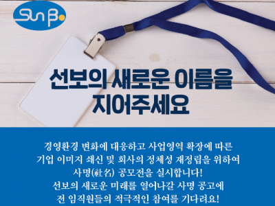<공모기간> 2020.02.01 ~ 02.29<공모내용> - 회사가 추구하는 가치 및 철학, 미래비전 반영 - 글로벌 기업 이미지<응모기준> 우리 회사의 고유명사인 '선보'는 그대로 살리고 뒤에 붙을 말을 공모 ('선보+~')<심사기준> 독창성, 상징성, 참신성, 활용가능성 (로고, 마크, 도메인, 상표 등)<수상작 발표> 2020.03 중<시상내용> - 대상 : 상금 100만 원 - 우수상 : 상금 50만 원 - 동상 : 상금 30만 원