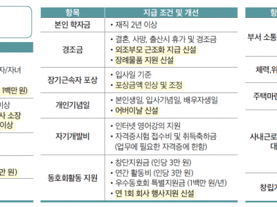우리 회사는 지난 1월 10일부터 14일까지 '가족친화 기업문화' 개선을 위한 온라인 설문조사를 시행하였다. 이번 조사는 새로운 2020년대를 맞이하여 선보의 가족친화 기업문화를 정착시키고 더욱 발전, 성숙시킬 수 있는 방안을 선보가족과 함께 고민하고자 임직원들의 적극적인 개선/건의를 받아들여 진행되었다.전사 임직원들이 참여한 조사 결과 전체 응답자의 60%가 선보의 기업문화를 '가족친화적'이라고 생각하고 있었으며, 28%가 학자금 및 의료비 지원제도를 최고의 복지제도로 선정하였다. 또한 개선사항으로 장기근속자 포상제도의 부활 / 자녀 대학교 학자금 지원 등을 최우선 순위로 선정하였다. 그밖에도 교육프로그램 중 개선 부분, 가족친화적 기업문화에 있어 부족한 점에 대한 직원들의 의견을 취합하였으며 이를 반영하여 2020년 1월 1일 부로 복지제도 개선안을 적용・시행하게 되었다.이번 복지제도 개선・시행으로 더 많은 선보가족이 일과 생활의 균형 속에서 행복한 직장생활을 해나가기를 기대한다.