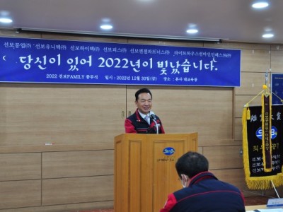 지난 12월 30일 오전 11시 본사 교육장에서 2022 선보 Family 종무식이 개최됐다. 이날 행사는 본사 임원과 팀장 및 수상자 74명이 참석한 가운데 ▲국민의례 ▲사가 제창 ▲선보인의 윤리강령 낭독 ▲시상식 ▲신년사(최금식 회장) ▲선보인의 결의문 낭독 ▲타임캡슐 개봉식 순으로 진행됐다. 본사 외 각 공장 종무식은 대표이사 및 공장장 주관하에 이날 오후 자체 실시했다. 시상식에서는 조선마이다스상·영업Pioneer상·플랜트 VE 혁신상을 비롯해 총 8개 부문에 걸쳐 상장과 부상이 전달됐다. 지난 2022년은 조선업 호황이라는 ‘기회’와 글로벌 경제 침체라는 ‘위기’가 동시에 찾아온 만큼, 임직원들의 열정이 더욱 빛을 발했던 한 해였다. 임인년을 마무리하며 개최한 종무식은 급변하는 시장 환경과 대내외 위기 속에서도 철저한 품질 확보와 경쟁력 향상을 목표로 달려온 선보 Family들이 서로의 노고를 치하하고 격려하는 시간이었다. 최금식 회장은 신년사를 통해 임직원들에게 경영 방향을 공유하고 신년 목표 달성을 향한 의지를 다시금 강조했다.