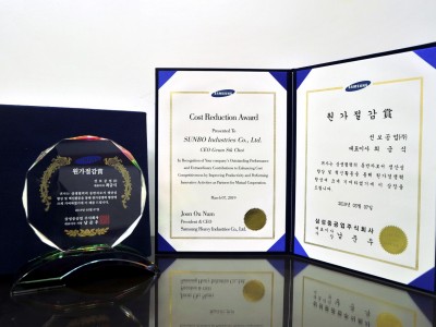 지난 3월 7일, 우리회사는 상생협력의 동반자로서 생산성 향상 및 혁신활동을 통해 원가경쟁력 향상에 크게 기여한 공로를 인정받아 삼성중공업주식회사로 부터 원가절감 상을 수상하였다.향후에도 지속적인 원가 개선 노력 및 품질 향상 활동을 통해 고객사와의 동반 상생 관계를 더욱 확고이 할 수 있도록 최선을 다할 것이다.