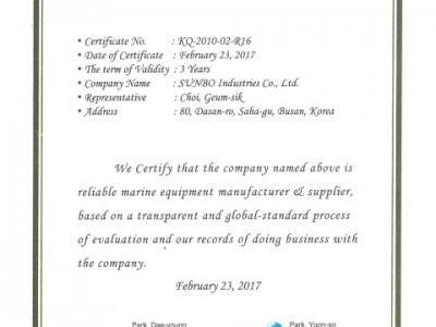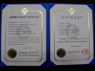 2017.2.23 선보공업(주)은 한국조선해양기자재공업협동조합(이하 조합)으로부터 "조선해양 우수기자재업체"로 재인증되었다. 조합은 한국조선해양플랜트협회 및 7대조선소 동반성장위원회와 함께 2010년부터 매년 '조선해양 우수기자재업체'를 선정하여 왔으며, 우리 회사는 2010년도에 선정된 이후 금번 재평가를 통해 차후 3년간(2017년~2019년) 자격유지가 결정되었다.선정된 기업은 국내외 조선해양기자재 유망 전시회 참가시 가점부여 등 홍보마케팅 지원, '조선해양의 날' 유공 대상자 표창 추천, 동반성장지원 프로그램 신청시 우선권 부여 등의 지원을 받을 수 있다.