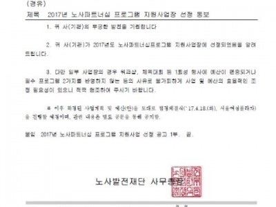 2017년 노사파트너십 프로그램 지원사업장 선정